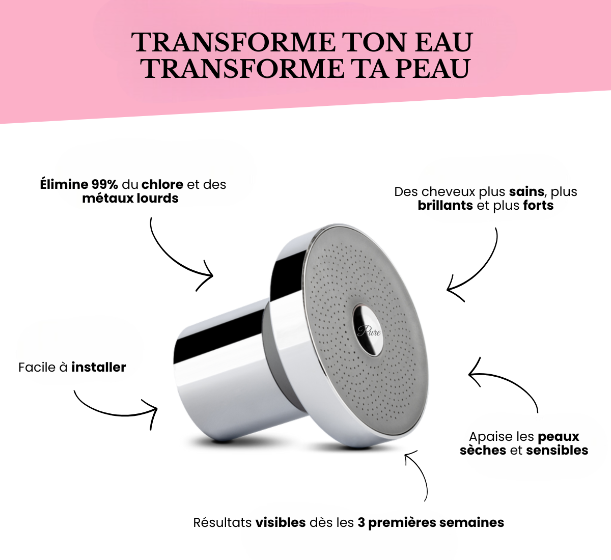 Every day, we shower in water that can be full of harsh chemicals. And without knowing it, we expose our skin and hair to what causes "acne, dryness, itching, irritated scalp, damaged or bleached hair...".