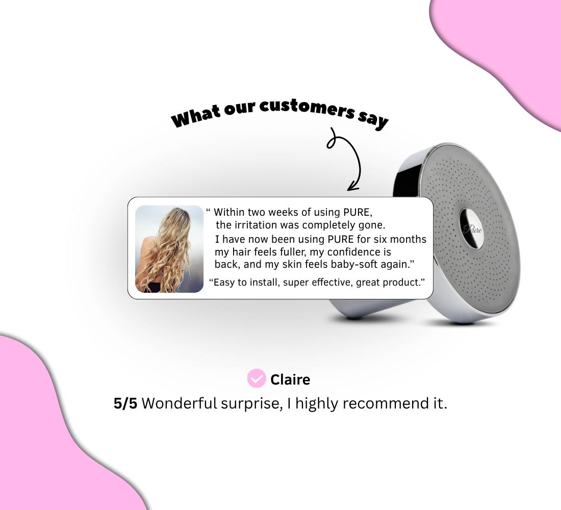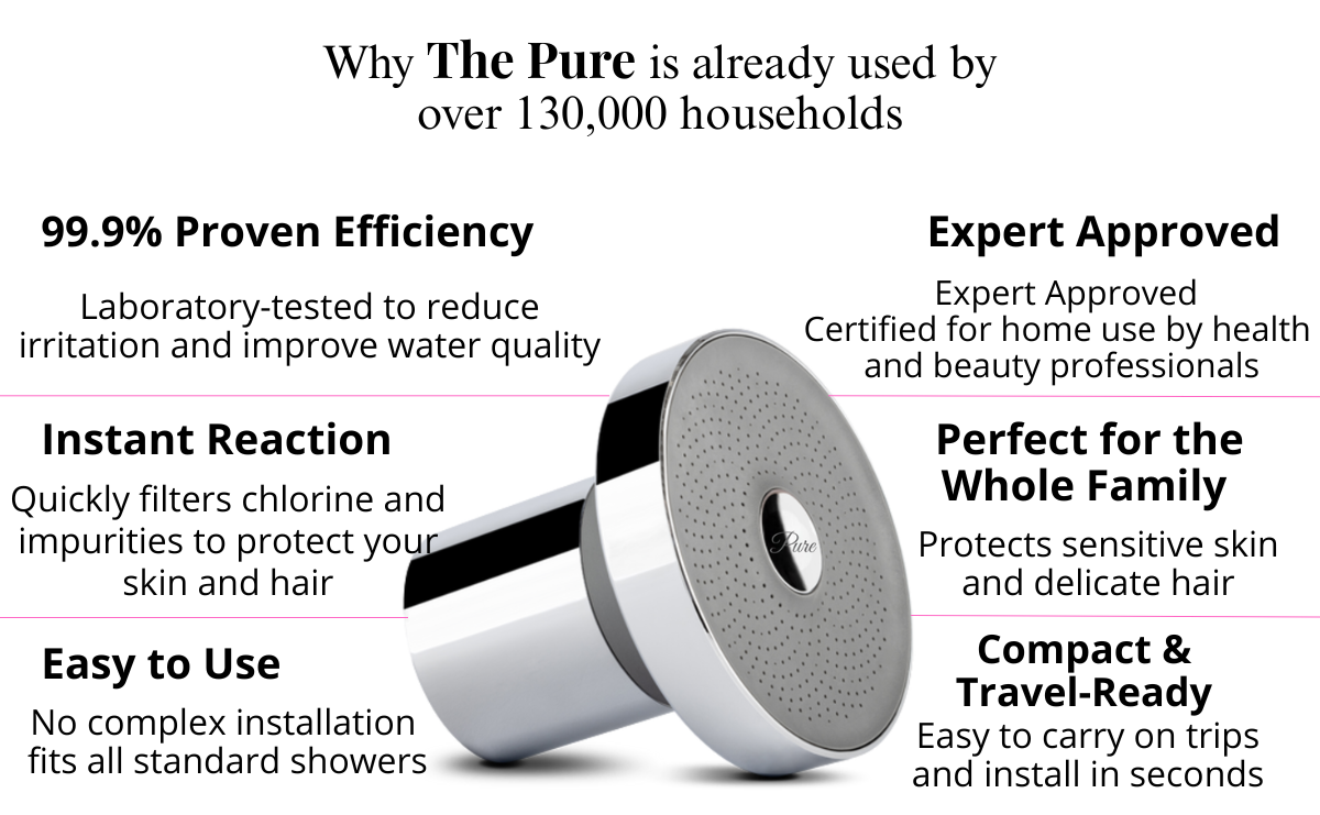 At PURE, we believe true beauty starts with the water you use every day. That's why our filtered shower head removes chlorine, heavy metals, and other hidden toxins, giving you, your skin, and your hair the purest water possible.